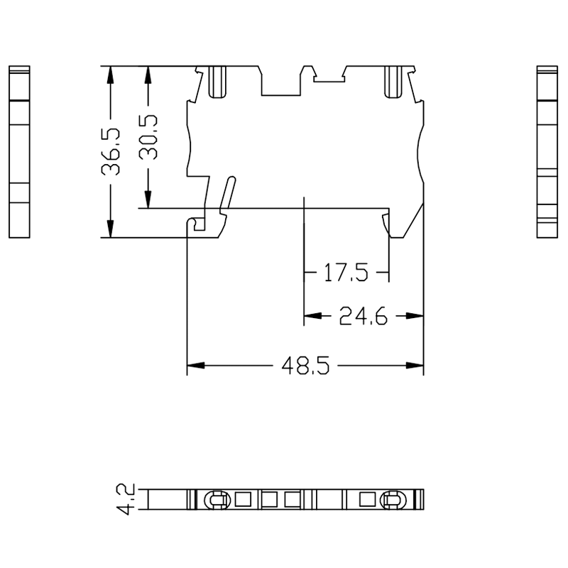 回拉式導(dǎo)軌接線端子,寬度\長(zhǎng)度\高度:4.2mm\48.5mm\36.5mm, 額定電壓:300V(cULus),500V(TUV), 額定電流:15A(cULus),17.5A(TUV), 適用線經(jīng):26-14AWG,0.08-1.5mm2