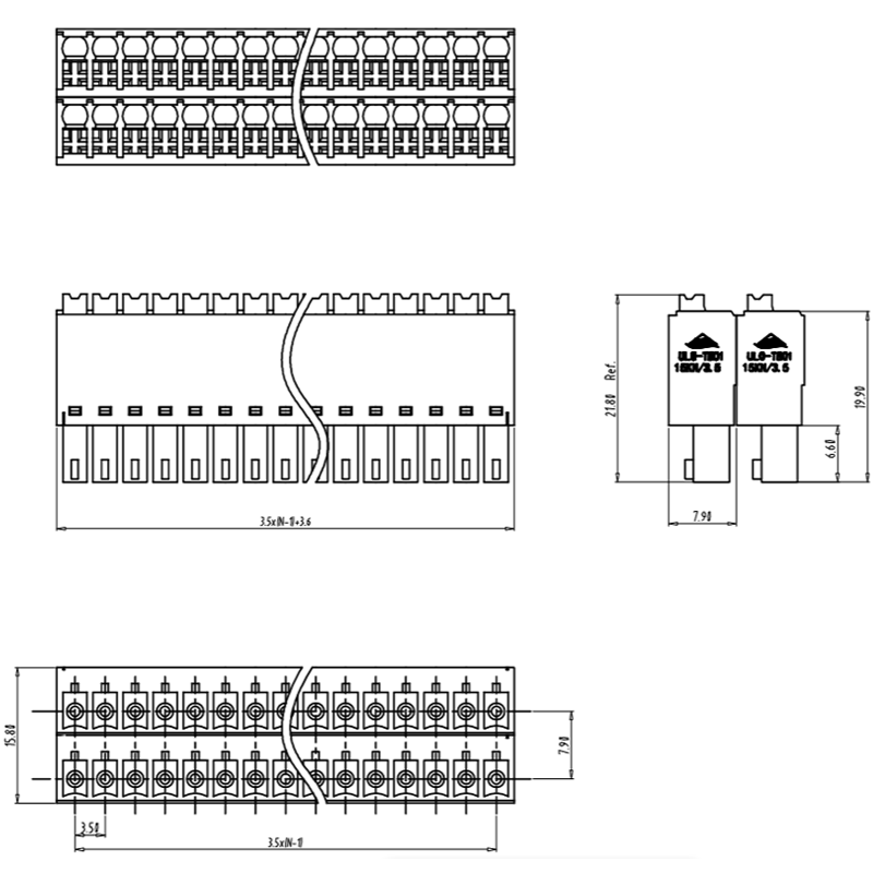 間距:3.5mm, 額定電壓:300V(cULus),160V(TUV), 額定電流:8A(cULus),8A(TUV), 適用線經(jīng):24-16AWG, 0.2-1.0mm2, 線數(shù):4P-48P