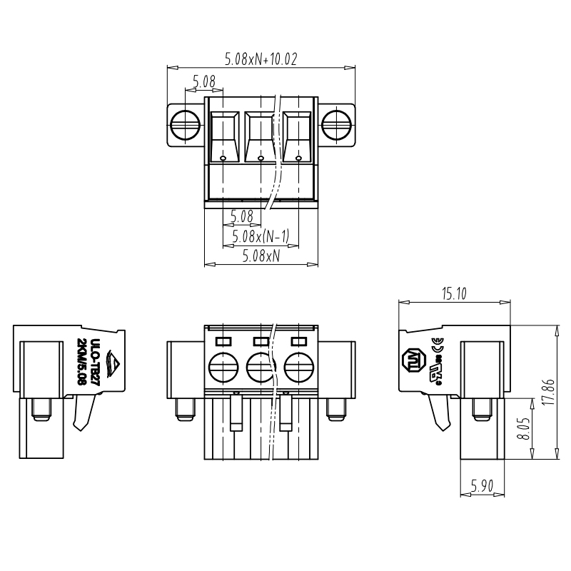 間距:5.08mm, 額定電壓:300V(cULus),320V(TUV), 額定電流:15A(cULus),15A(TUV) , 適用線經(jīng):28-12AWG,1.0-2.5mm2, 線數(shù):2-24P