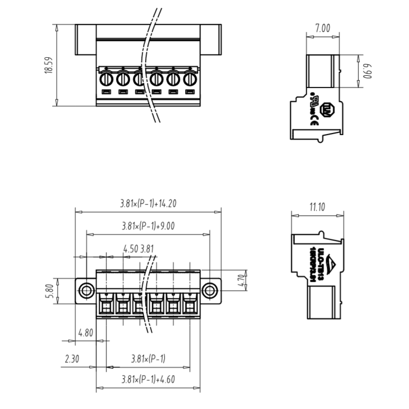 間距:3.81mm, 額定電壓:300V(cULus),250V(TUV), 額定電流:8A(cULus),7A(TUV), 適用線經:28-16AWG, 0.75-1.5mm2, 線數:2-24P
