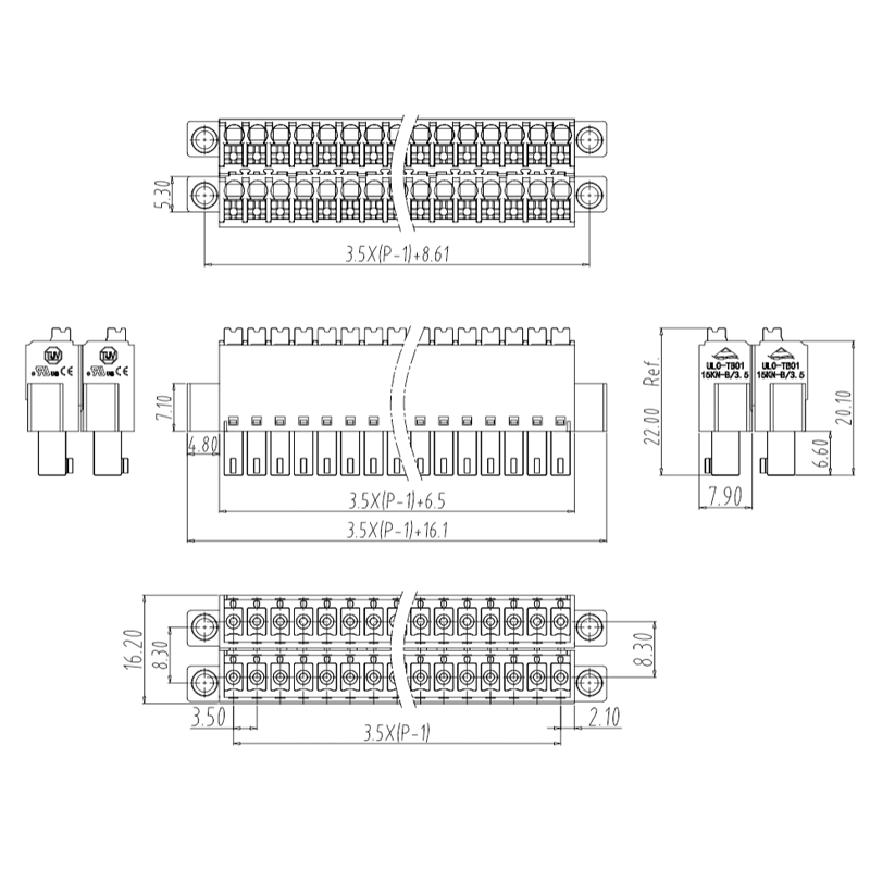 間距:3.5mm, 額定電壓:300V(cULus),160V(TUV), 額定電流:8A(cULus),8A(TUV), 適用線經(jīng):24-16AWG, 0.2-1.0mm2, 線數(shù):4P-48P