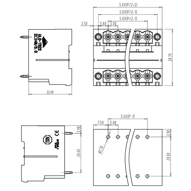 間距:5.0mm, 額定電壓:300V(cULus),320V(TUV), 額定電流:15A(cULus),10A(TUV), 線數(shù):4P-48P