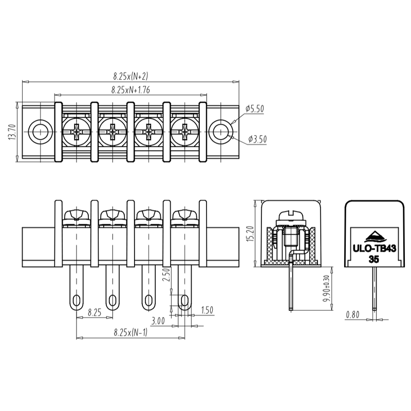 間距:8.25mm, 額定電壓:300V(cULus),250V(TUV), 額定電流:20A(cULus),24A(TUV), 適用線經(jīng):22-12AWG,0.5-2.5mm2, 線數(shù):2-24P