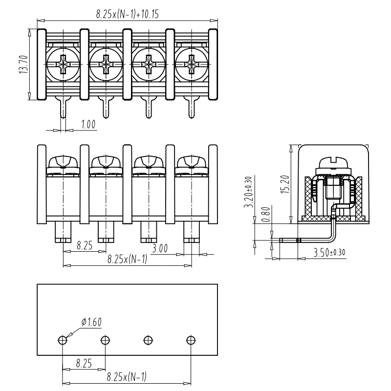 間距:8.25mm, 額定電壓:300V(cULus),250V(TUV), 額定電流:20A(cULus),24A(TUV), 適用線經(jīng):22-12AWG,0.5-2.5mm2, 線數(shù):2-24P