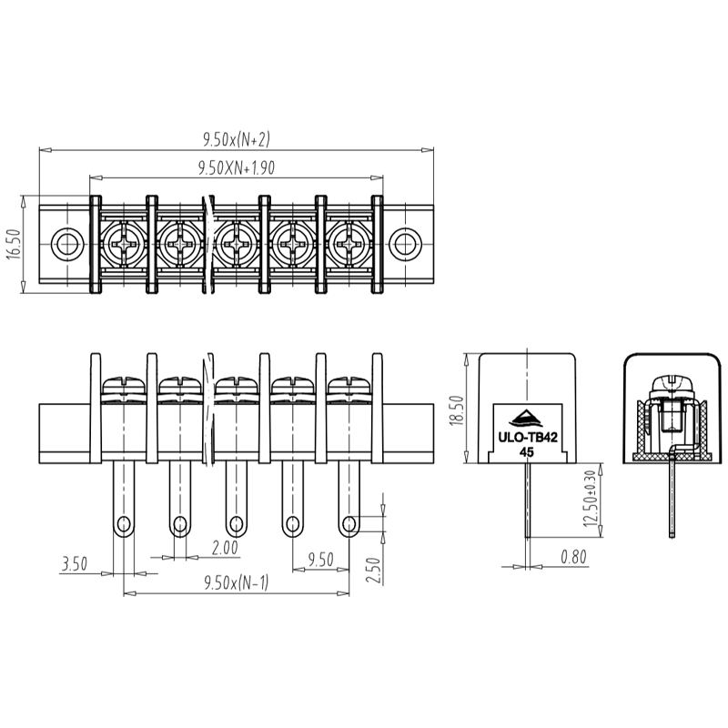 間距:9.5mm, 額定電壓:300V(cULus),250V(TUV), 額定電流:20A(cULus),24A(TUV), 適用線經(jīng):22-12AWG,0.5-4.0mm2, 線數(shù):2-24P