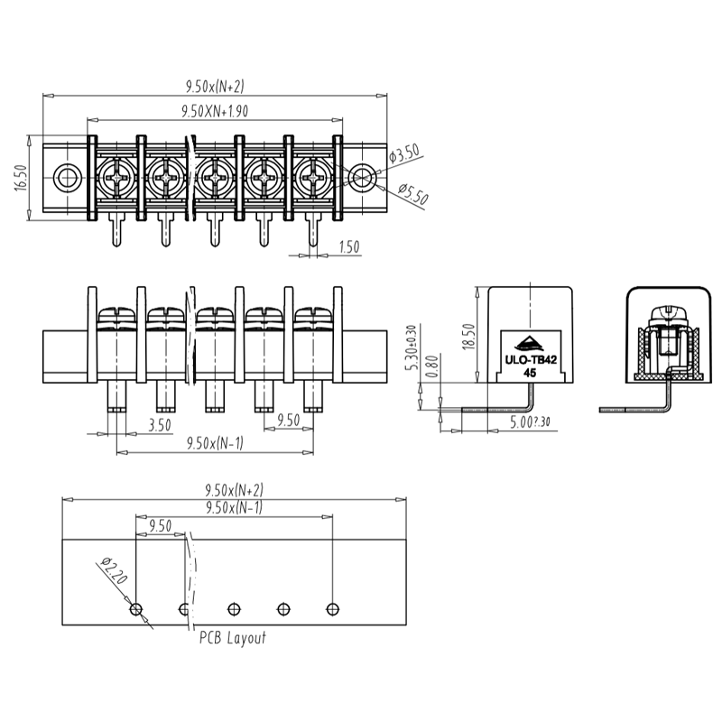 間距:9.5mm, 額定電壓:300V(cULus),250V(TUV), 額定電流:20A(cULus),24A(TUV), 適用線經(jīng):22-12AWG,0.5-4.0mm2, 線數(shù):2-24P